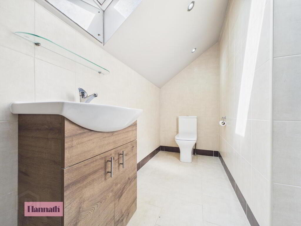 A well-appointed en-suite bathroom featuring a white suite and a shower cubicle with stylish wood-effect wall panelling. The space is finished with light tiling and a chrome heated towel rail, benefiting from a skylight that floods the room with natural light.