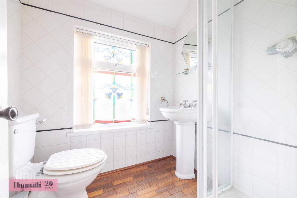 Three Piece Family Suite Comprising of; Shower Enclosure, Low Flush WC and Pedestal Wash Hand Basin. Tiled Fully. Single panel radiator. Stained Glass Window.